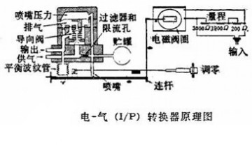 电-气转换器把电动调节器输出的电信号转换成气动信号,以控制气动薄膜调节阀。它们可以是电流对压力(I/P)的转换器,也可以是电压对压力(E/P)的转换器。典型的(I/P)转换器示意地表示于图中。