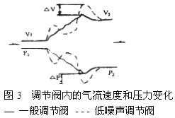 图3中的虚线表示一般调节阀工作时气流速度和压力变化曲线,实线表示对应的低噪声调节阀工作时气流速度和压力变化曲线。从图中可以看出,在保证总压降(P1-P2)不变(相应V1-V2也不变)的前提下,一般调节阀在两个节流孔处,分别出现两个速度高峰和两个压力低谷。而在低噪声调节阀内,就像设置一系列的节流孔,煤气流过时,出现一系列小的速度高峰,总体上气流速度平稳上升,其最大值明显小于一般调节阀的最大速度峰值,两者相差△V。对应的压力也平稳下降,其最小值要大于一般调节阀的最小压力谷值,两者相差△P。这样就降低了喷射噪声,也是低噪声调节阀之所以噪声低的原因之一。该低噪声调节阀可以使噪声降低18dB(A) 左右。