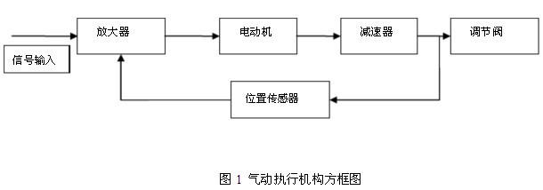 1.2气动薄膜调节阀执行机构的组成 气动执行机构具有结构简单,动作可靠,性能稳定,价格低,维护方便,防火防爆等优点,特别是对于现场有防爆要求时,应选用气动执行机构,且接线盒为防爆型。在许多控制系统中获得了广泛地应用,它分为正作用和反作用两种执行方式。正作用执行机构在输入信号增加时,推杆的位移向外;反作用执行机构在输入信号增加时,推杆的位移向内。在我们濮阳甲醇厂使用的调节阀大部分都是气动执行机构,执行机构尽管在结构上不完全相同,但基本结构都包括放大器、可逆电机、减速装置、推力机构、机械限位组件和位置反馈等部件如图1。